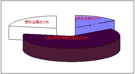 廠家市場調(diào)研情況來看,如下圖所示:對(duì)于4月鋼材行情都持不懂看法,其中認(rèn)為“鋼價(jià)能有小幅反彈”的占15%,“鋼價(jià)會(huì)延續(xù)下跌”的占62%,“鐵價(jià)逐漸企穩(wěn)”的占23%。由此可見,過半數(shù)廠家對(duì)后市預(yù)期仍較悲觀,而且3月之前鋼價(jià)的反彈并沒有給廠家?guī)矶啻蟮男判,繼續(xù)看跌的商家較4月初有所增加,最近鋼材市場有降價(jià)走勢(shì),漲缺乏實(shí)質(zhì)性需求支撐,動(dòng)力不足,而受低庫存及高成本支撐,下跌難有空間。短期來看,熱軋價(jià)格就這么弱勢(shì)維持。